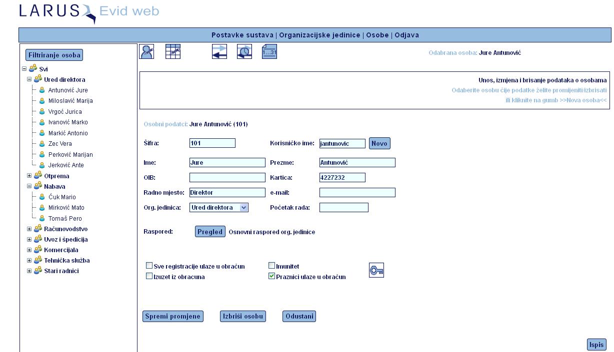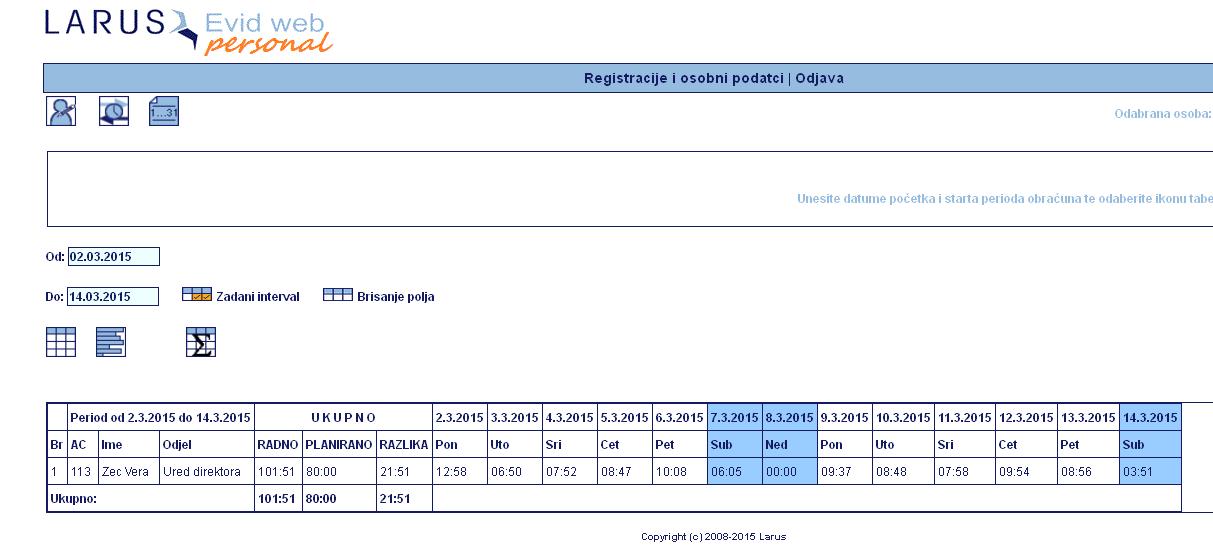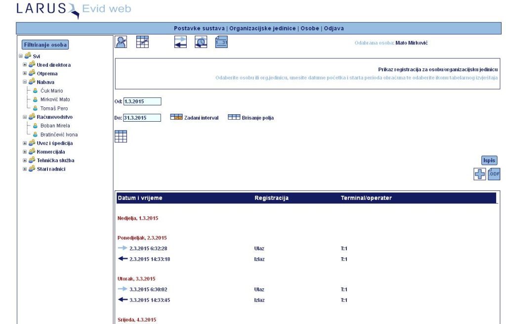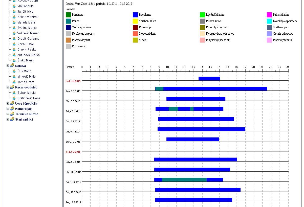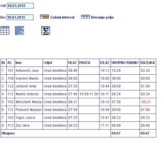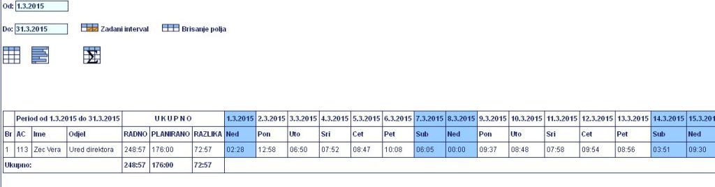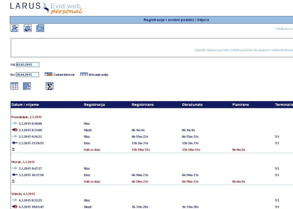 Tabelarni prikaz svih registracija sa prikazom obračuna sati. Također je moguće vršiti korekciju pojedinog tipa događaja.