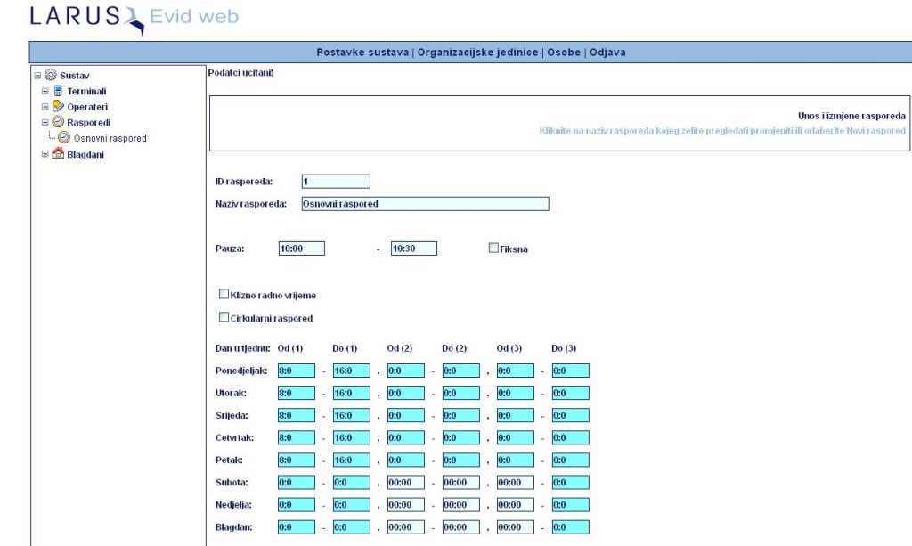 Sustav za evidenciju radnog vremena EVID omogućuje Vam jednostavnu i učinkovitu kontrolu prisutnosti djelatnika na poslu te opciono kontrolu pristupa pojedinim prostorima. Velike mogućnosti podešavanja parametara, omogućuju maximalno prilagođenje sustava radnom vremenu i načinu obračuna korisnika te se znatno skraćuje vrijeme potrebno za obračun radnih sati u firmi. Program radi kao WEB aplikacija, instalira se na jednom računalu (najbolje serveru) i dostupan je se bilo kog računala preko WEB preglednika.