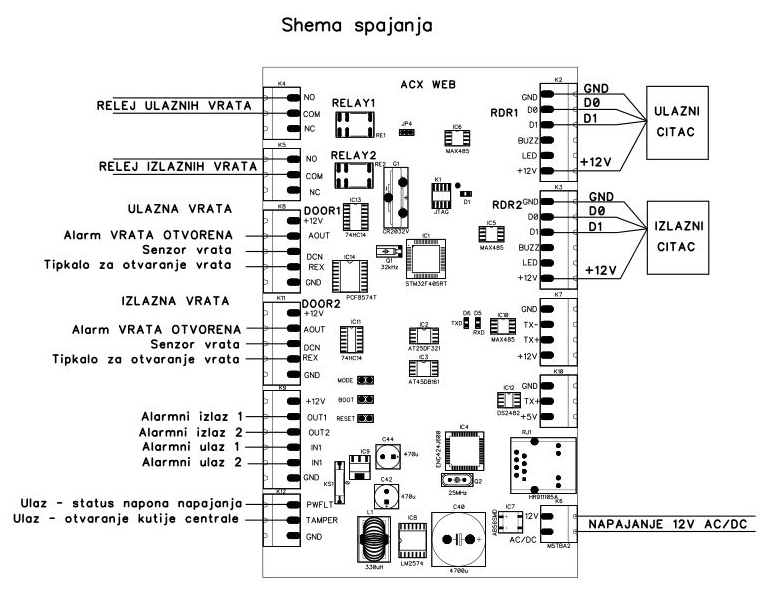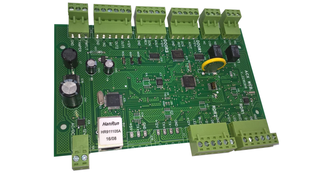 ACXWEB je kontroler namijenjen za kontrolu prolaza.Na uređaj se mogu spojiti dva čitača kartica (wiegand ili RS485 serijska komunikacija). Kontroler radi u modovima: dva čitača na jednim vratima (ulaz i izlaz na karticu) ili jedan ulazni čitač na vratima, a izlaz na tipku ili kvaku. Dodatni signali omogućuju praćenje statusa vrata, alarmiranje ako se vrata otvore bez dozvole, kontrola signalnih led dioda i zvučnika na čitačima. Mogućnost praćenja vanjskih alarma, neovlaštenog otvaranja uređaja i nestanka napajanja.