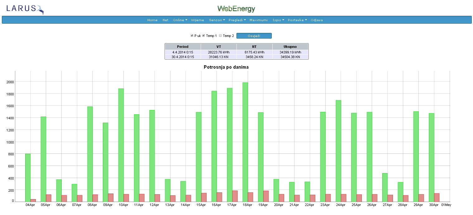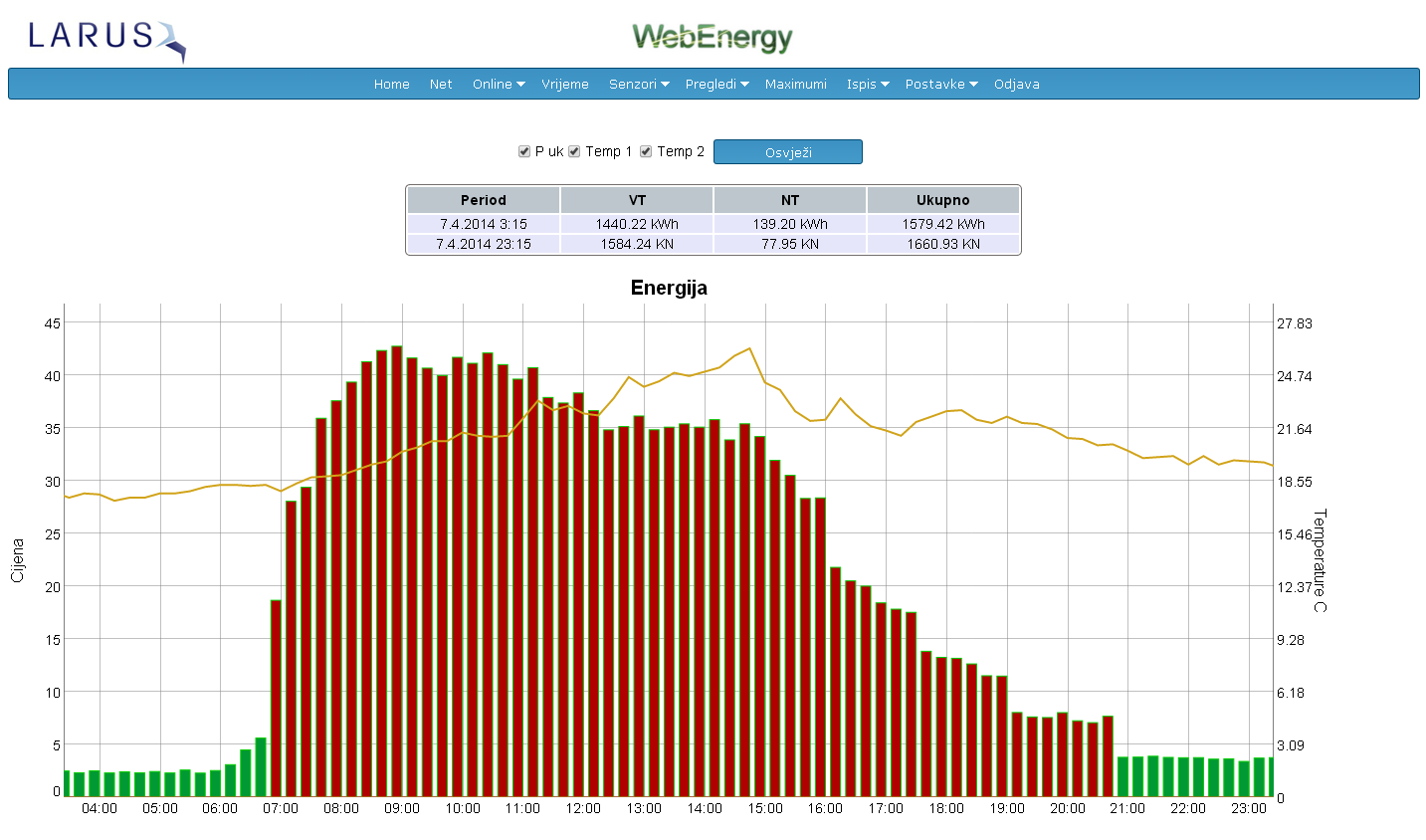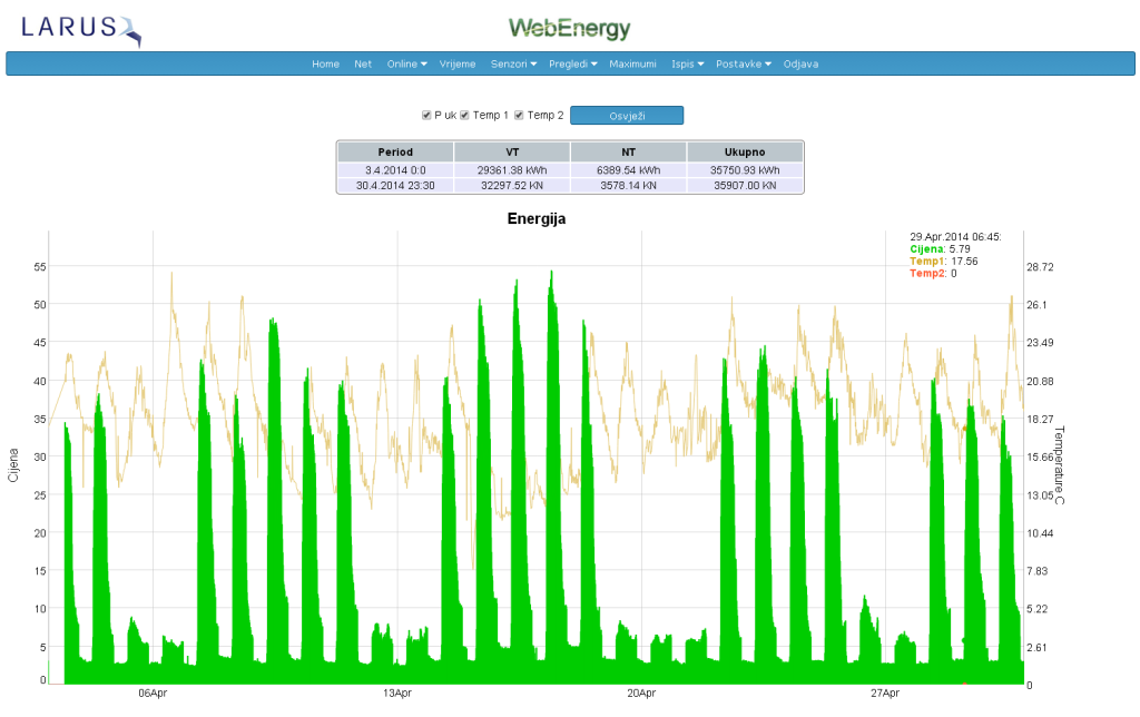 Webenergy omogućava i financijski prikaz potrošnje. Krivulje mogu biti detaljne (prikaz potrošnje energije u 15 minutnom periodu) ili dnevne, prikaz potrošnje u jednom danu. Potrošnja se prikazuje odvojeno za višu i nižu tarifu. Također se dobiva ukupno potrošena energija (i cijena) u danom vremenskom periodu. Dnevni i mjesečni maximumi prikazuju maximalnu potrošnju u 15 minutnom intervalu. Grafovi se mogu dobiti za cijeli mjesec sa posebno označenim danom i satom kada je postignut mjesečni maximum. Webenergy također može pratiti i kretanje napona sustava, te prikazati minimalni, maximalni i prosječni napon u 15 minutnom intervalu. Na uređaj se mogu priključiti i dva senzora temperaure. Senzori su poluvodički, adresibilni i mogu biti udaljeni od uređaja maximalno 100 metara. Senzori su vodootporni, tako da je moguća njihova montaža i van objekta.