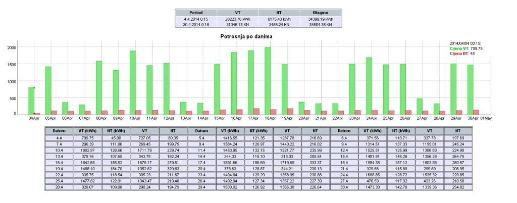 Detaljan pregled električne potrošnje kroz 15-min intervale.