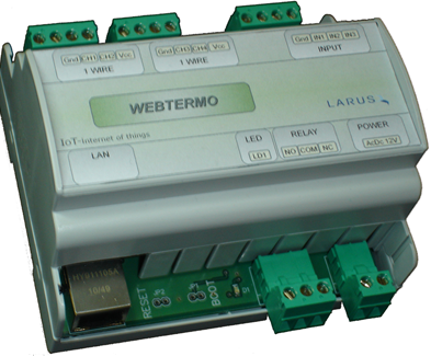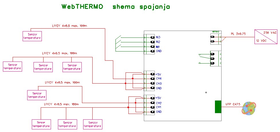 Webtermo je mini web server za kontrolu temperature u objektima. Izmjereni podaci se spremaju na poluvodički disk u uređaju i u svakom trenutku moguće je izvršiti pregled i analizu izmjerenih podataka. Podaci se mogu pregledati grafički i tabelarno. Za pristup uređaju nije potreban nikakav programski paket. Dovoljan je bilo koji web preglednik. Na webtermo je moguće spojiti do 8 adresibilnih senzora temperature. Za svaki senzor se može podesiti donja i gornja granična temperatura, histereza alarma i parametar korekcije senzora. "Online" mod rada omogućuje praćenje trenutne temperature na monitoru računala. U slučaju pojave alarma, aktivira se zvučni alarm na računalu preko kojeg se vrši nadzor. Alarmiranje se može vršiti i preko SMS poruka ili e-mail poruka. Sustav može prihvatiti do 5 telefonskih brojeva i 5 e-mail adresa na koje će se slati alarmne poruke. Za svaki senzor posebno se definira na koju od mogućih adresa ili brojeva telefona se šalju poruke.