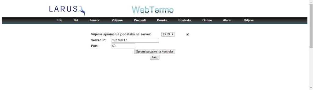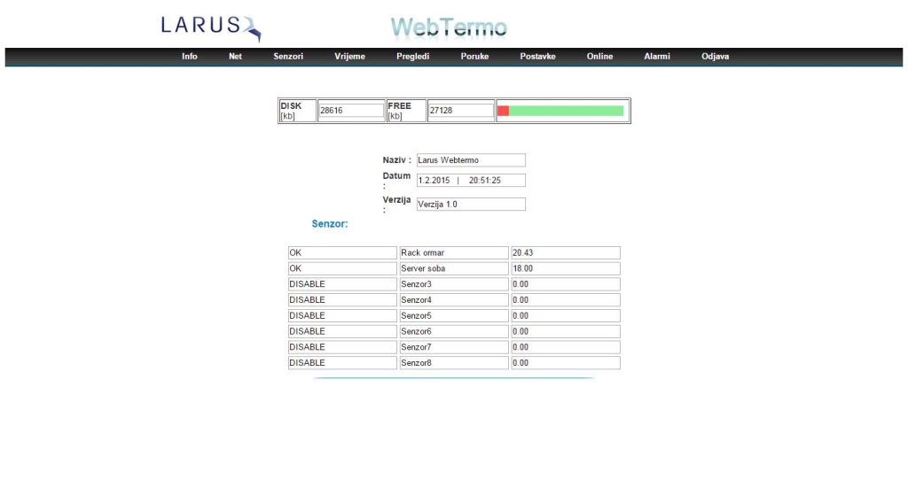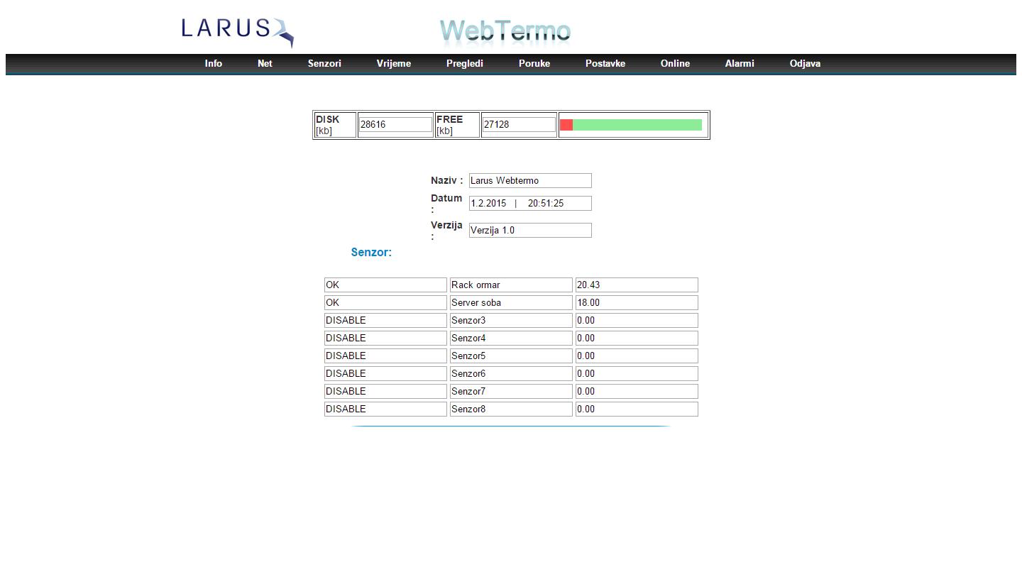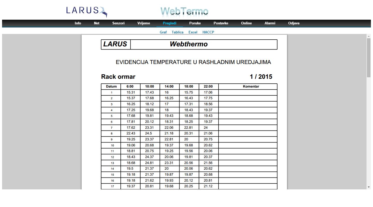 Svi izmjereni podaci se spremaju na poluvodički disk. Ugrađeni diskovi su posebnim algoritmom zaštićeni od "efekta habanja", što produžuje vijek trajanja diska barem 10 puta. Kapacitet diska je dovoljan da čuva podatke više od 5 godina. Izmjereni podaci mogu se pregledati grafički i tabelarno. Web stranice ugrađene u uređaj daju intuitivan i izuzetno atraktivan prikaz podataka. Za pregled podataka nije potrebna instalacija nikakvog dodatnog programskog paketa. Sve se nalazi u samom uređaju. Sustav omogućuje jednom dnevno slanje SMS poruke sa trenutnim stanjem temperatura. Moguće je podesiti vrijeme kada će se poslati SMS poruka. Webtermo daje izvještaj o temperaturama prilagođen HACCP zahtjevima. Izvještaj se dobije u PDF formatu i pogodan je za spremanje u arhivu.